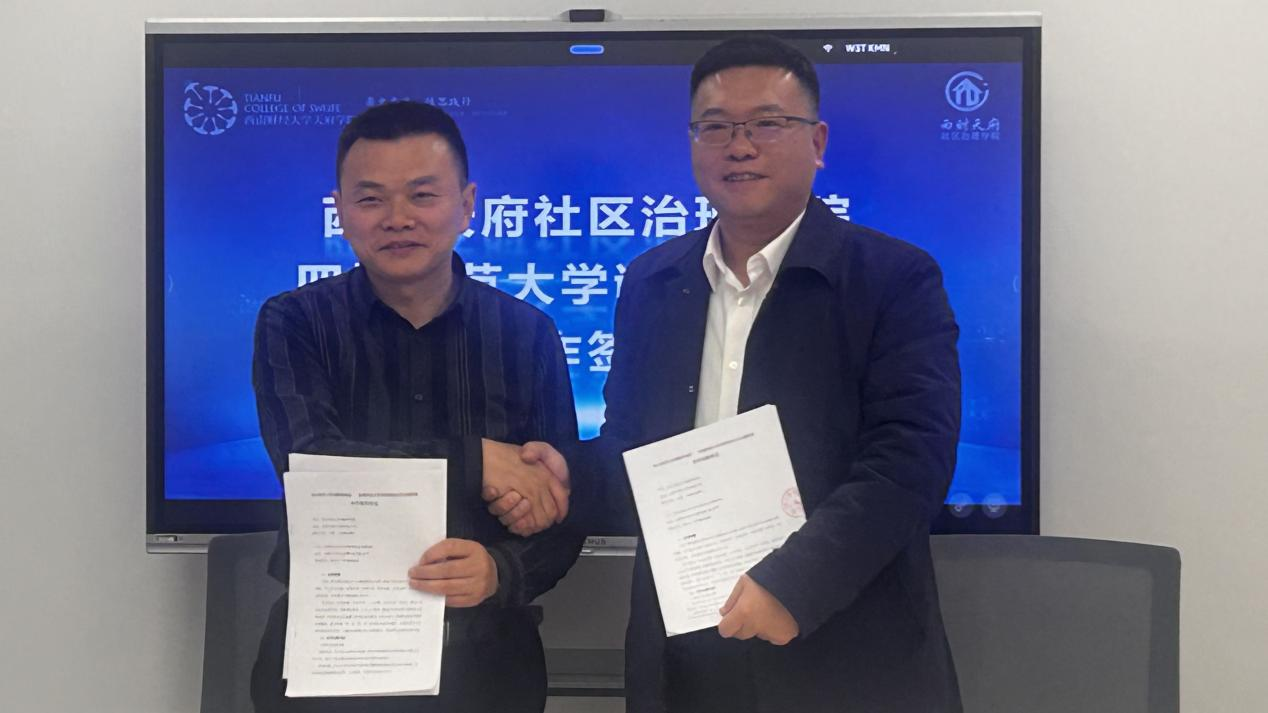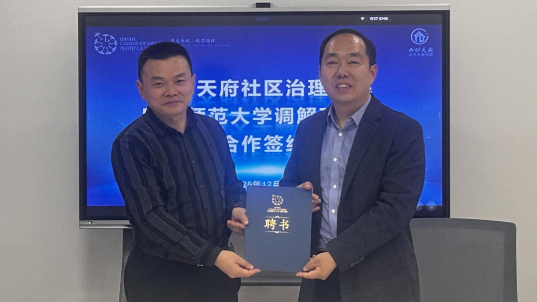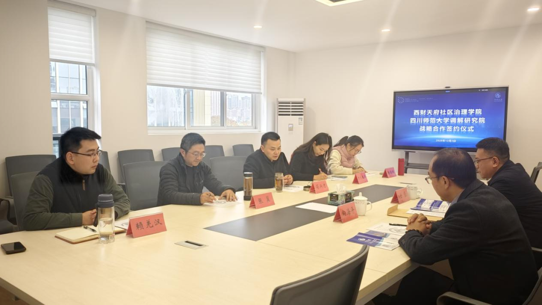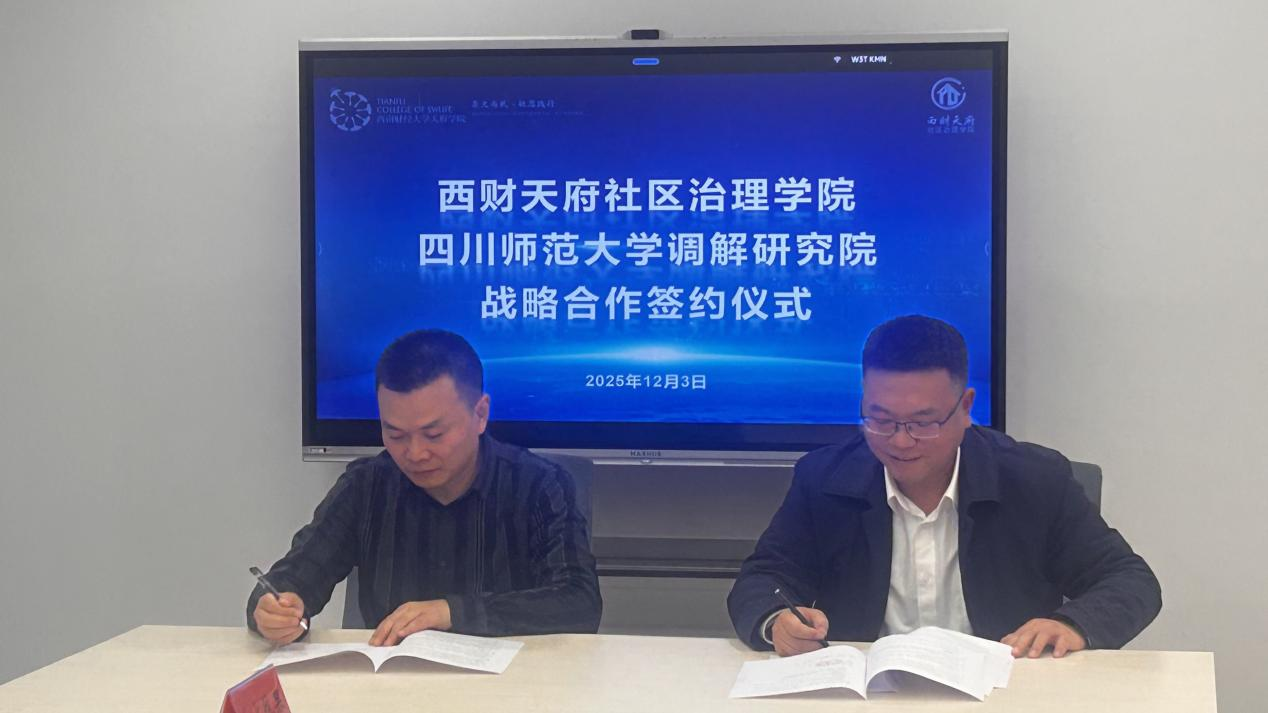 2025年12月3日下午,西财天府社区治理学院与四川师范大学调解研究院正式签署战略合作协议。双方将依托各自平台与资源优势,围绕科研合作、课程开发、人才培养、智慧调解平台建设等领域开展深度合作,共同推动社区治理现代化与调解事业的专业化发展。