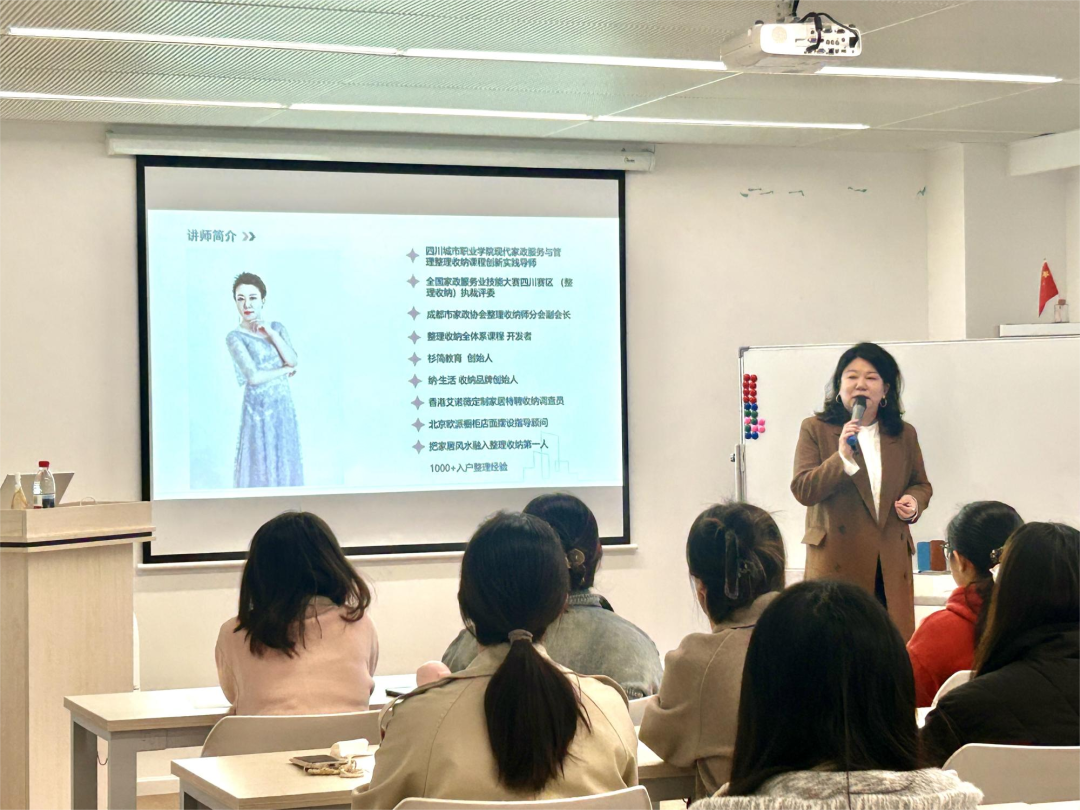 上午场讲座以《整理生活,创享事业——家居整理师入门与创业指南》为题,特邀全国家政服务技能大赛四川赛区(整理收纳)执裁评委、成都市家政协会整理收纳师分会专家担任主讲。讲师从市场洞察入手,深入浅出地剖析了家居整理这一蓝海市场的现状与盈利模式。她指出,家居整理不仅是简单的家务劳动,更是一门融合空间规划、心理学和生活美学的专业服务,尤其契合女性细致、耐心的特质。通过分享从0到1启动个人整理事业的实战经验与成功案例,为在场学生描绘了一条将个人兴趣转化为职业价值的清晰路径。在互动环节,针对“宿舍空间优化”等贴近学生生活的问题,讲师给出了专业建议,引发了同学们的强烈共鸣与积极讨论。